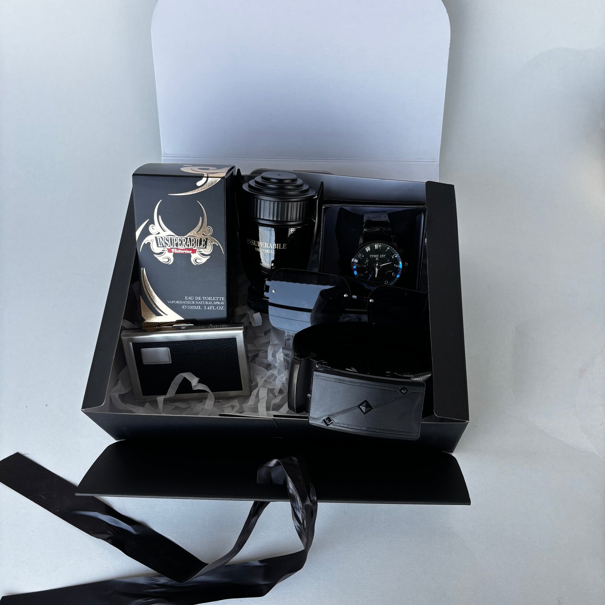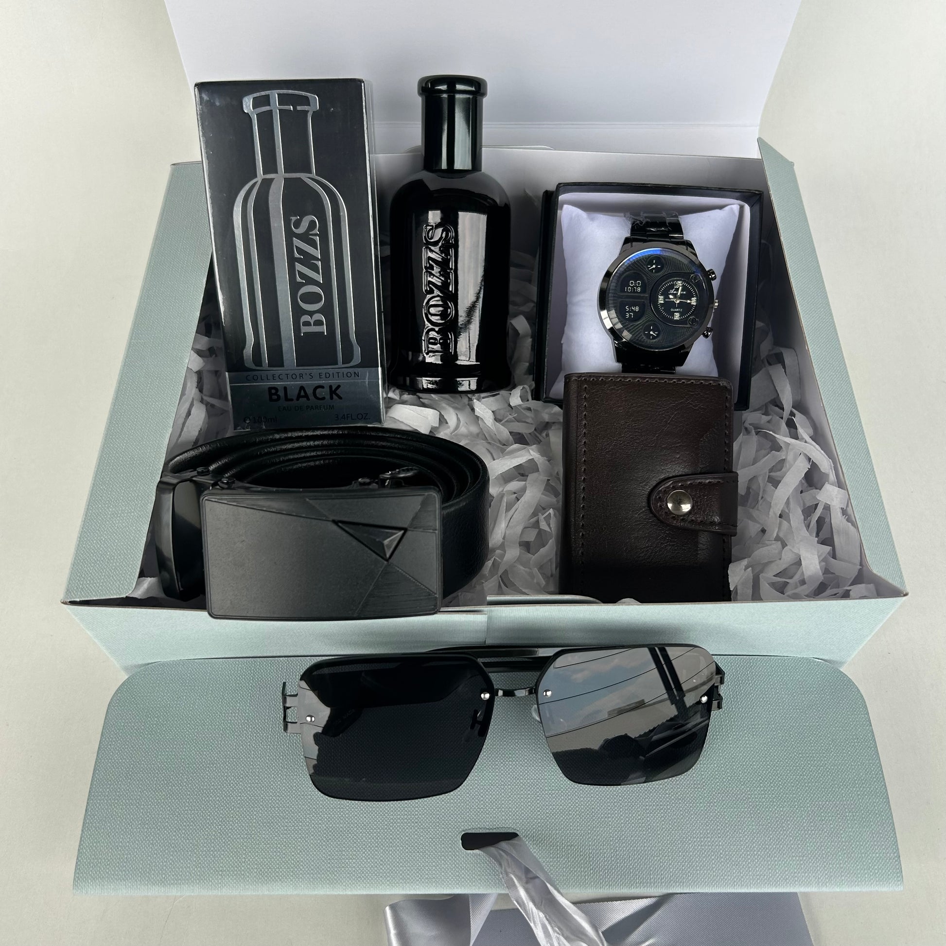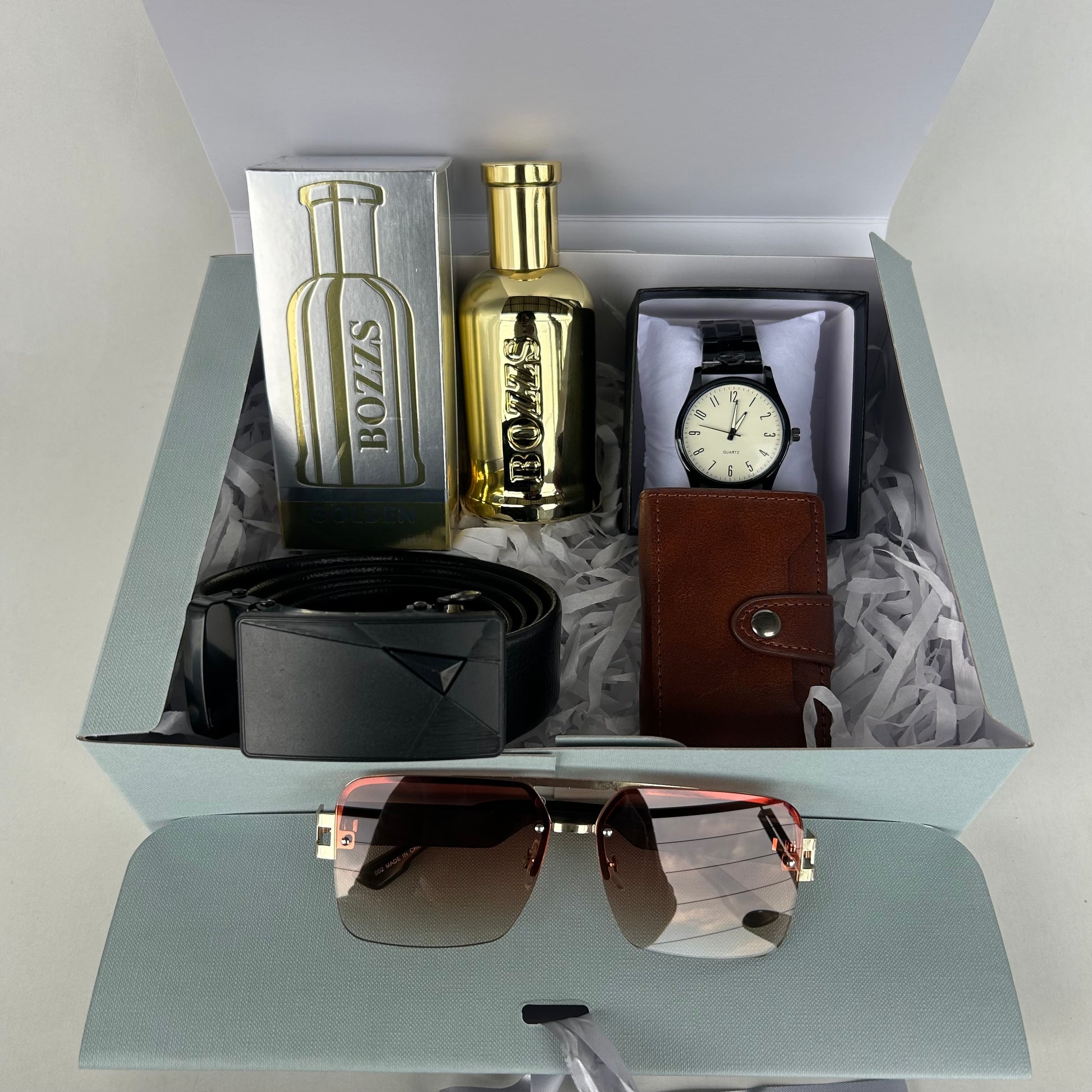 This gift package includes a watch, belt, cologne, shades and a cardholder