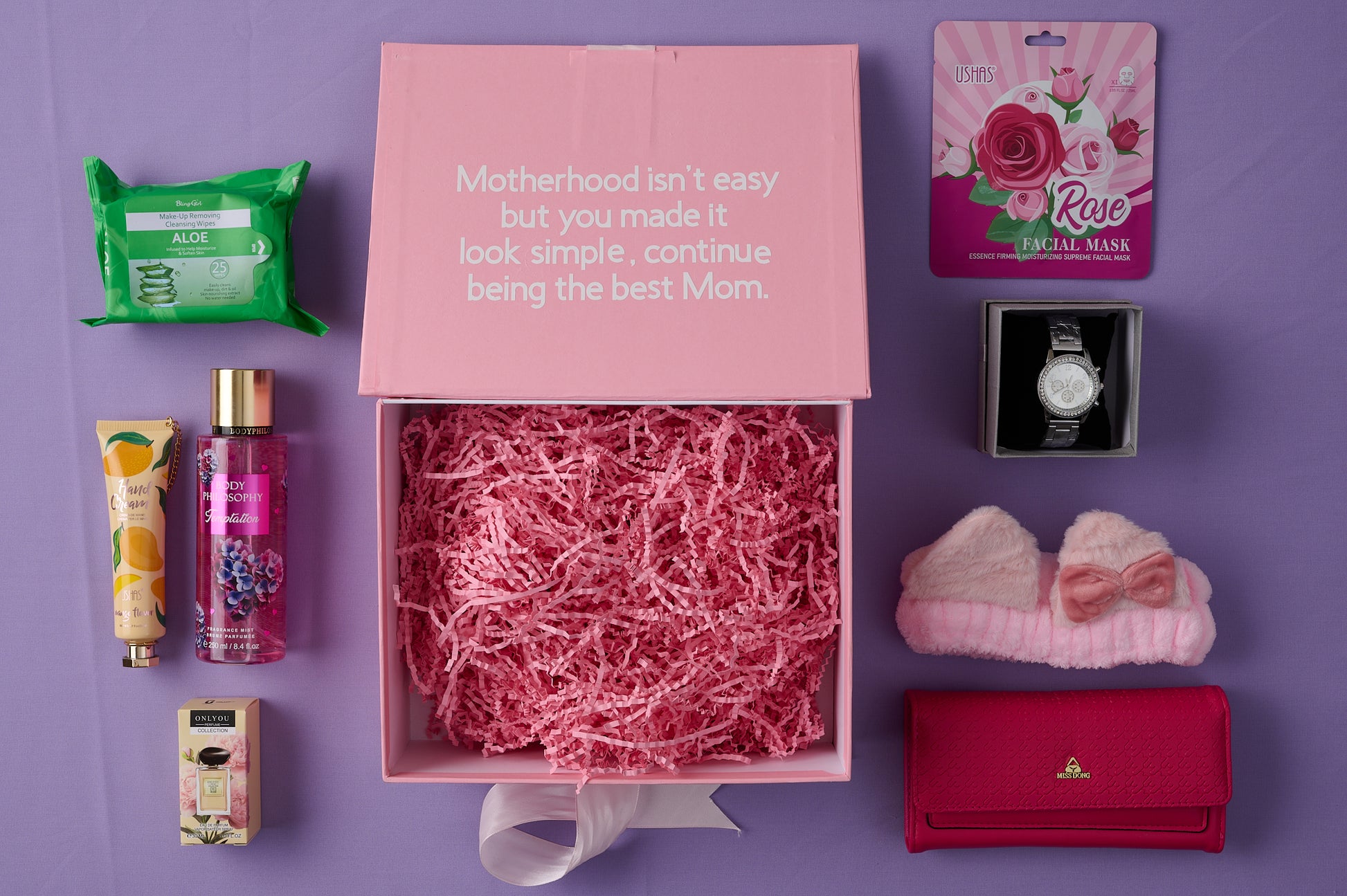 Luxury gift box, personalised with a name and message on the box. Package includes; purse, watch, wipes, body mist, luxury soap, head band, face mask and hand cream