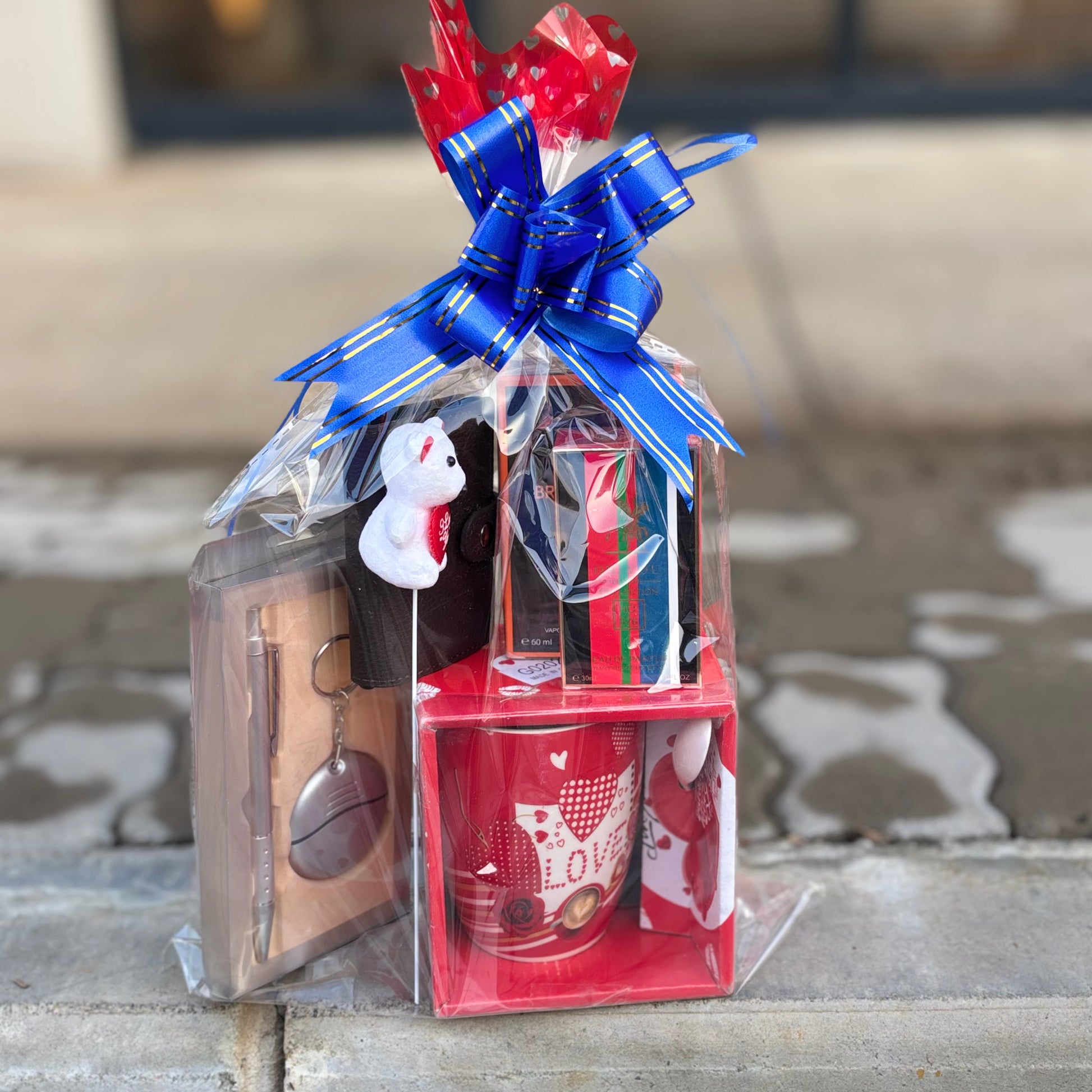 This elegant gift set includes a charming teddy bear holding an “I Love You” heart, a beautifully designed ceramic mug with romantic detailing, a stylish pen and keyholder set, cardholder and two luxury fragrances to add a touch of sophistication